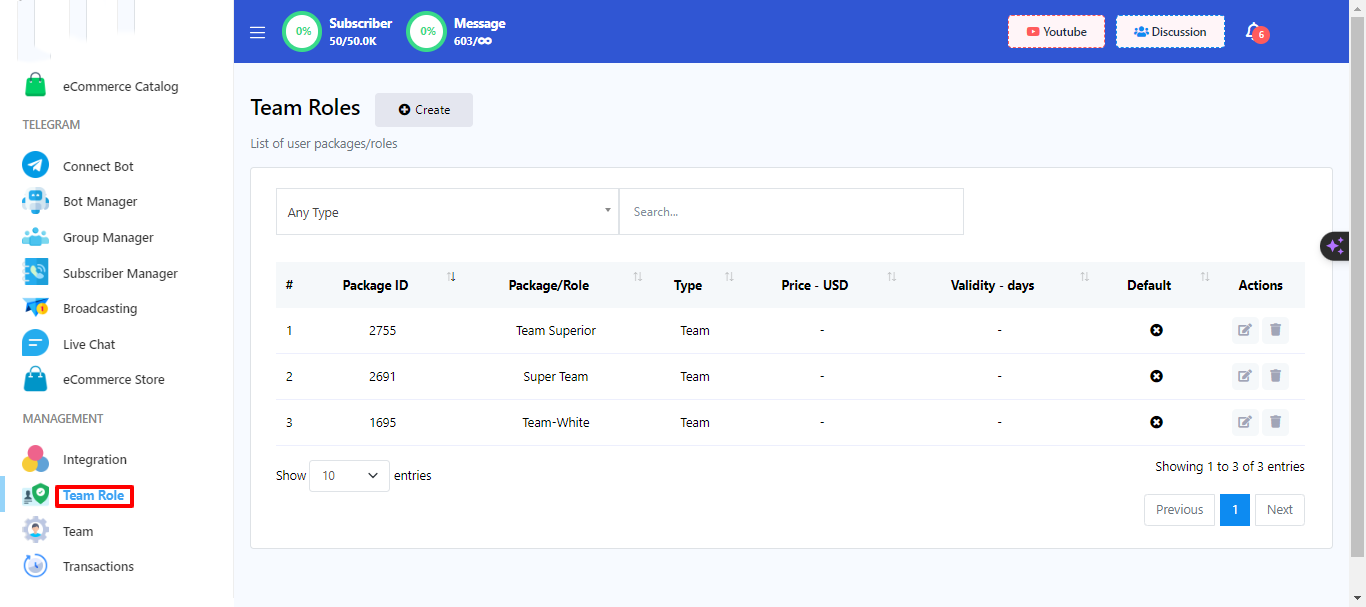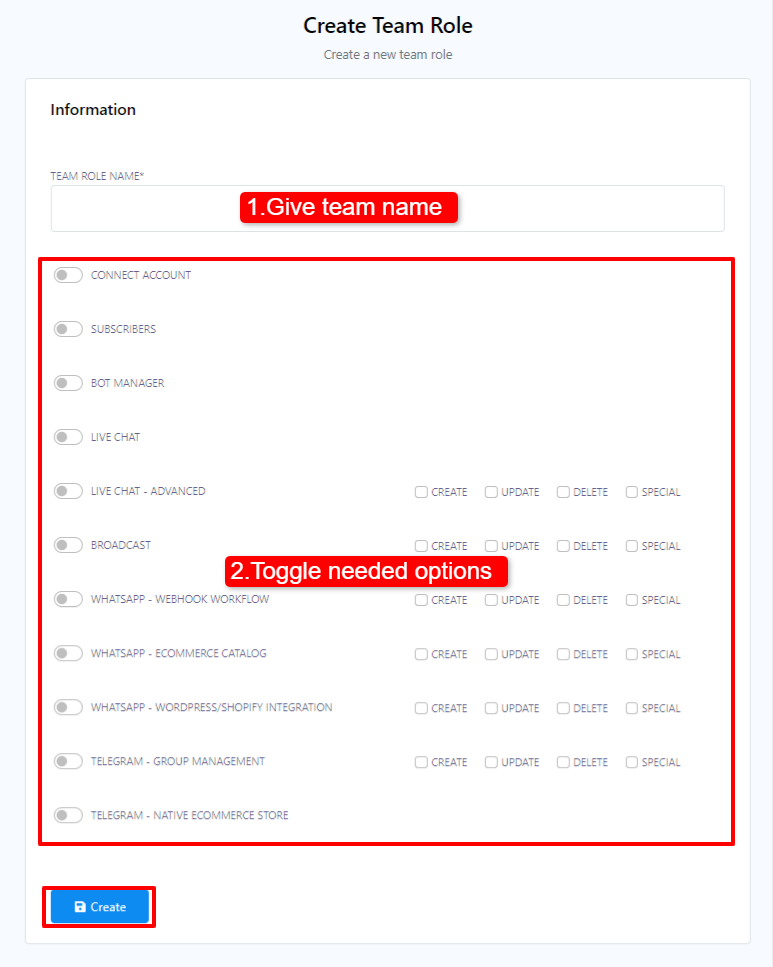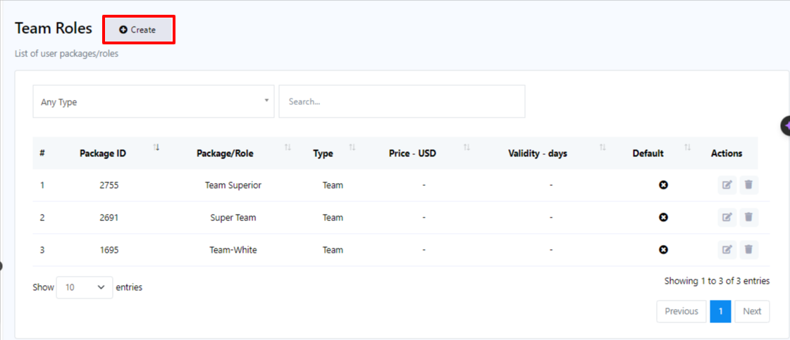 - Within the Team Role menu, click on the `Create` button.