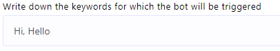 1. Keyword Triggering: To initiate the bot using specific keywords,double-click on the `Start Bot Flow` element. This action will open the `Configure Reference` in the left side, featuring ten fields and two buttons. In the first field, you can input a list of comma-separated keywords. When a user enters text in the messaging window that matches any of these keywords, the bot will be triggered.